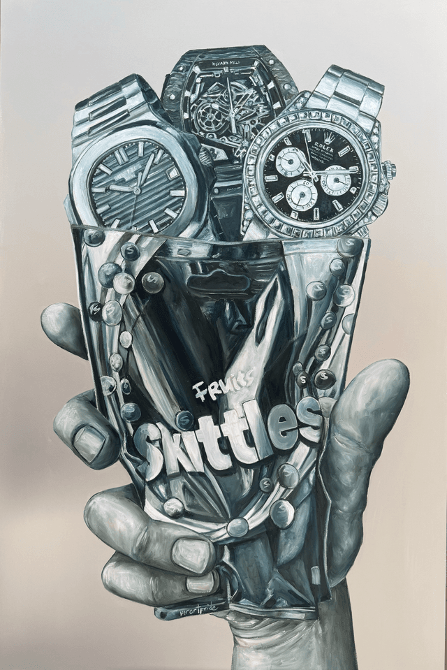 Marcin Rogal aka MrArtPride, is a Polish self-taught artist and “renaissance man” known for his unique pop art style of paintings. His art is mainly inspired by pop culture, capitalism and cartoons. Rogals work radiates joy and sarcasm, and it clearly translates to the observer. MrArtPride in his works mixes pop culture characters and elements and adds them to extravagant products like Patek Philippe watches and credit cards, creating an ironic art pieces that is anything but mundane.